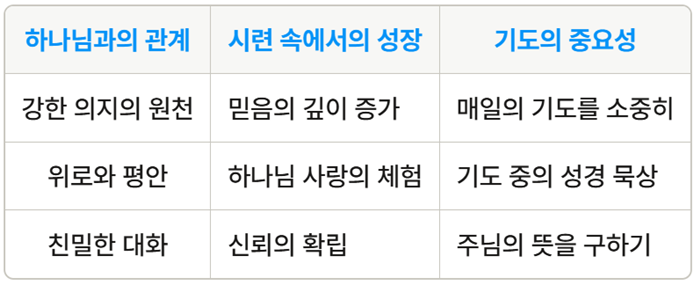 시련의 순간, 우리는 하나님과 더욱 가까워질 수 있는 기회를 맞이하게 됩니다. 어려움 속에서 하나님께 기도하고 의지하는 것은 우리 신앙을 더욱 견고하게 만들어 줍니다.