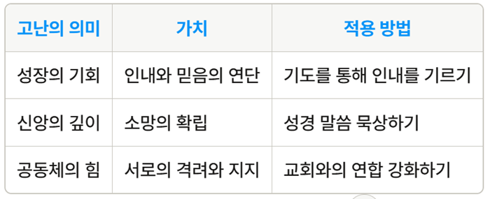 고난은 우리 삶에서 피할 수 없는 부분입니다. 그러나 고난은 단순히 고통을 의미하는 것이 아니라, 우리를 더 강하게 하고 신앙을 깊게 하는 기회가 될 수 있습니다. 성경은 이러한 고난의 가치를 여러 차례 강조합니다.