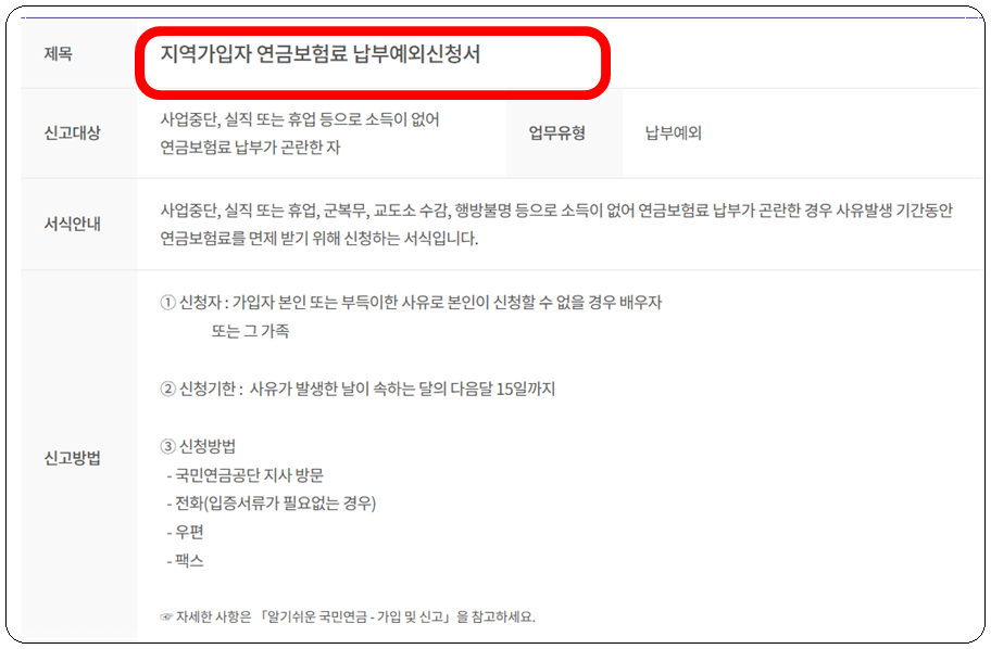 신청 방법은 국민연금공단 홈페이지에서 '납부 예외 신청' 메뉴를 선택하고, 신청서를 작성하여 제출하면 됩니다. 이때, 관련 서류를 함께 제출해야 하며, 심사를 거쳐 납부 예외가 승인됩니다.