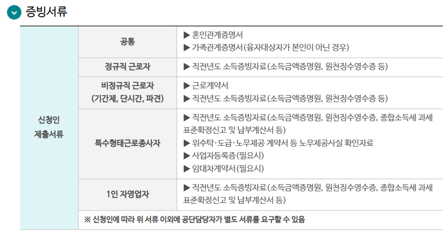 ⓛ 혼례비, 자녀학자금, 의려비, 부모요양비, 장례비, 자녀양육비(재직요건) 융자신청 저금리대출 및 대출 검색할 때 현재 소속 또는 노무 제공 사업장에 3개월 이상(융자신청일이 속한 달의 직전 달 말일에 고용된 근로자가 없는 사람에 한한다) 일 것 다만, 일용근로자는 신청일 이전 90일 이내에 [고용보험법 시행규직] 별지 제7호 서식의 고용보험 확인 방법과 근로내용 확인서에 따른 근로일수가 45일 이상인 경우로 하고, 건설기계 종사자 등 생계비 대출은 일일 단위로 노무를 제공하는 특수형태 근로종사자는 신청일 이전 90일 이내에 입, 아직 신고내역상 작업수 45일 이상인 경우로 한다(소득요건) 월평균소득이 296만 원(2023년 기준) 이하일 것. 다만, 비정규직 근로자는 소득요건을 적용하지 않음