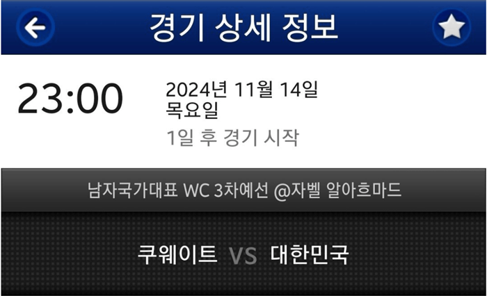 2024년 11월 14일 오후 11시, 대한민국과 쿠웨이트가 2026 북중미 월드컵 아시아지역 3차 예선 B조 5차전을 자베르 알아흐마드 국제경기장에서 치릅니다!