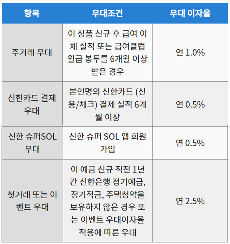 - 슈퍼 SOL 회원가입 인정 요건 : 이 예금 만기 전전영업일까지 가입 상태 유지시 (적금 개설 전후 관계없이 만기 전전영업일까지 가입 유지시 적용)